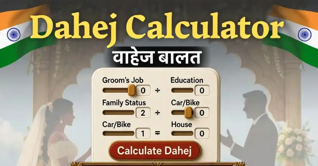 "Dahej (Dowry) pratha ek samajik burai hai." > Yeh calculator sirf mazaak aur awareness ke liye hai. Hum kisi bhi tarah se dowry system ko support nahi karte. Is calculator se aane wali value ka asli zindagi se koi lena-dena nahi hai.